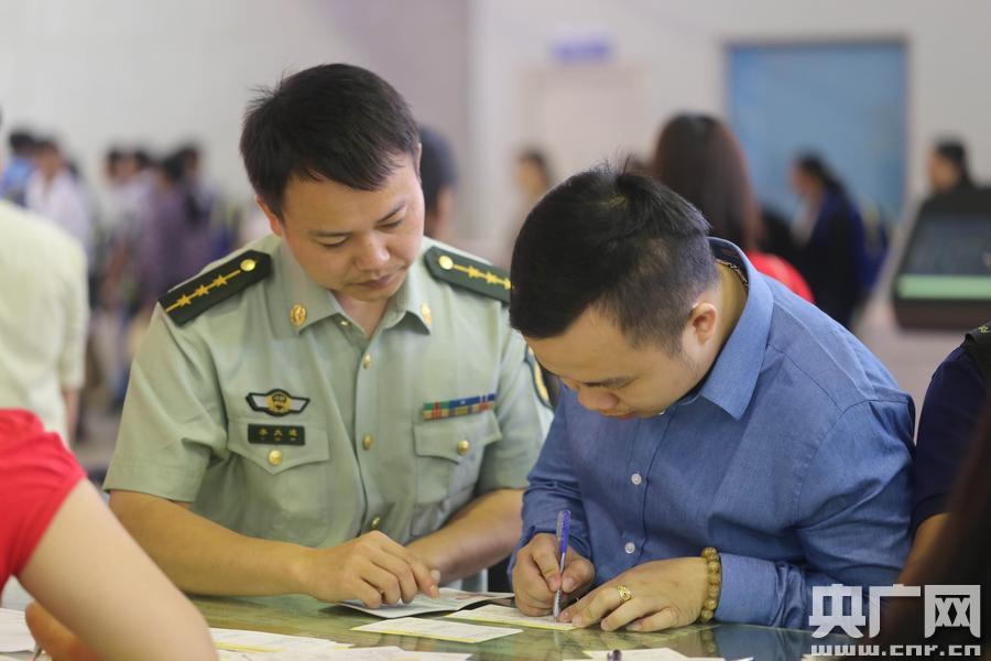 邊檢員幫助旅客填寫入境卡片(央廣網(wǎng)發(fā) 屈景峰 攝)