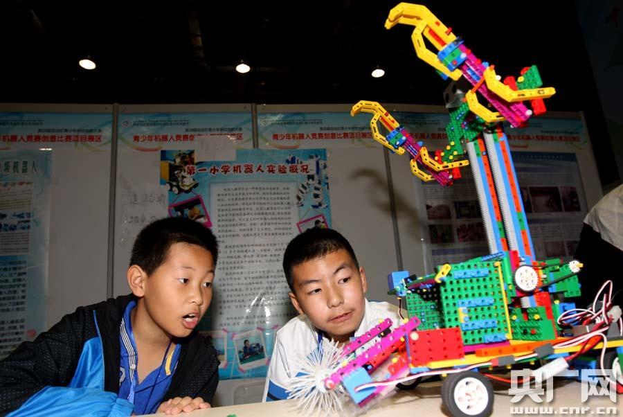 兩名參賽選手正在展示自己制作的垃圾清掃機(jī)器人(央廣網(wǎng)發(fā) 周建玲攝)