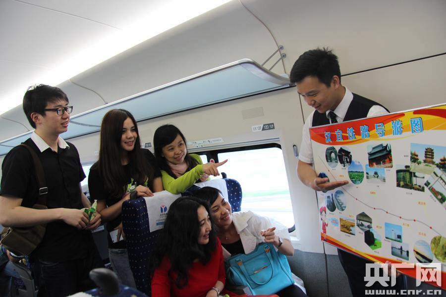 武漢客運段城際動車組車間C48組列車長田飛為旅客做漢宜線導游服務(央廣網(wǎng)記者 張毛清 攝)