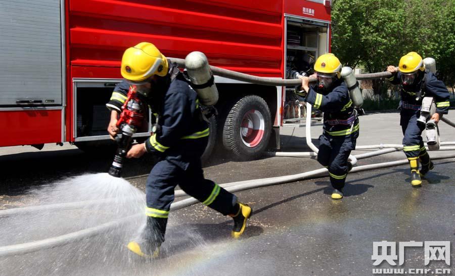 消防戰(zhàn)士參加攻堅(jiān)組百米梯次進(jìn)攻操科目的比賽(央廣網(wǎng)發(fā) 周建玲 攝)