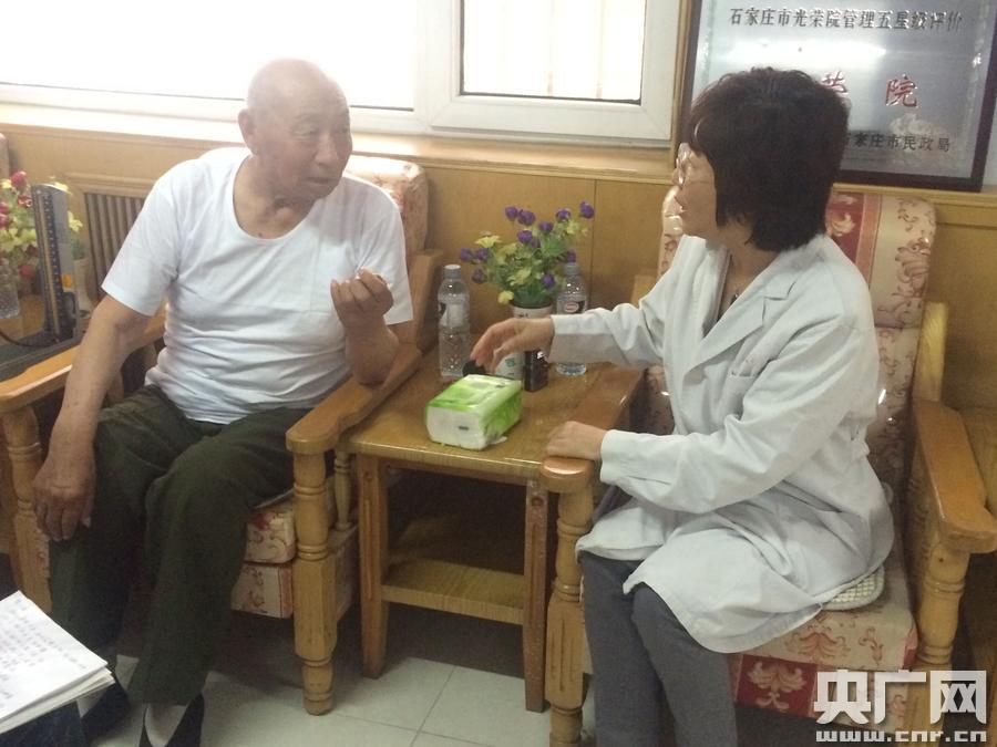 “有沒有做過心電圖?平時(shí)都吃些什么藥?”5月28日,來自北京醫(yī)科大學(xué)的韋云教授來到辛集市光榮院,這里住著20多位老人,他們大多參加過抗日戰(zhàn)爭(zhēng)和抗美援朝,平均年齡近80歲。韋云為老人們開展了一對(duì)一的醫(yī)療咨詢!八膯栴}是這樣的最主要的就是預(yù)防心梗。您自己還要注意不要?jiǎng)×业耐蝗坏倪\(yùn)動(dòng),冬天要注意報(bào)保暖。明白了嗎?”韋云對(duì)光榮院的護(hù)士囑咐道。