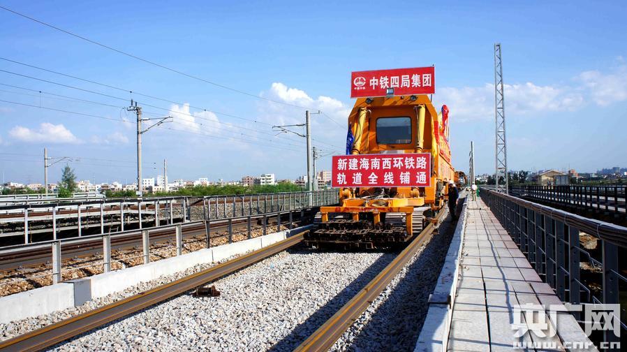 央廣網(wǎng)?6月30日消息(記者許云 吳媚苗)6月30號(hào)下午18時(shí)整,伴隨著鋪軌車作業(yè)的轟隆聲,鐵路工人們將海南西環(huán)鐵路上最后一根長(zhǎng)鋼軌在?诨疖囌靖浇佅。至此,正線全長(zhǎng)345公里的海南西環(huán)鐵路正式完成鋪軌!靶陆êD衔鳝h(huán)鐵路鋪軌工程全線雙線鋪通!”——廣鐵集團(tuán)?诠こ探ㄔO(shè)指揮部副指揮長(zhǎng)林鎮(zhèn)洪用響亮的聲音宣布道。