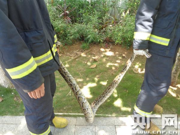 為了及時(shí)解除險(xiǎn)情,現(xiàn)場指揮員經(jīng)過研究決定,命令:由特勤班4名戰(zhàn)斗員穿好防護(hù)裝備利用捕抓器將蛇抓住。11時(shí)14分,消防官兵成功將蛇捕獲,蟒蛇估計(jì)長約2米。
