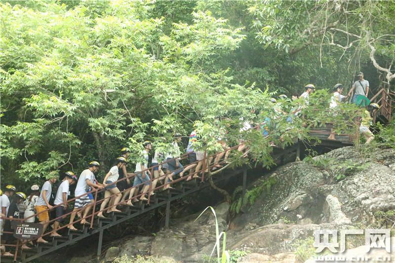 在景區(qū)夢幻谷,可以看到不少排著隊伍參加踏瀑戲水的游客,他們在原生態(tài)的雨林叢林中挑戰(zhàn)不同難度的戲水關(guān)卡,無論是大人還是孩子,都裝備齊全興致盎然地比拼闖關(guān),不時聽見嬉戲打鬧的歡笑聲。