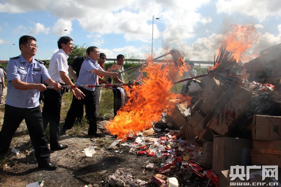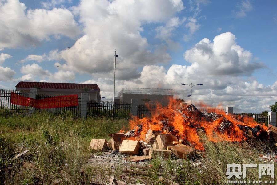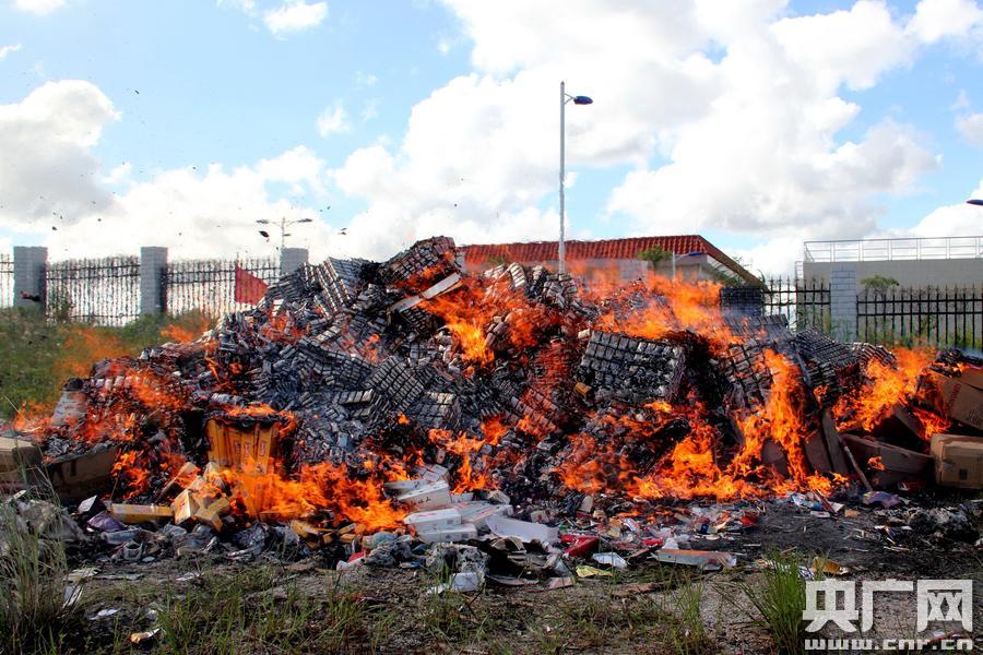 當天下午15時30分,在廣東茂名市郊的一塊空地上,邊防官兵與茂名市煙草專賣局、打私辦、海關、經(jīng)偵等職能部門現(xiàn)場的工作人員先將這些無合法手續(xù)的香煙搬下車,堆放在一起。由于涉案香煙數(shù)量多,銷毀前,執(zhí)法人員協(xié)調(diào)了兩輛中型貨車才裝運完畢。卸載后,一箱箱的香煙堆積一起,就如同一座小山丘。下午16時,執(zhí)法人員用汽油將香煙點燃,經(jīng)過近1個多小時燃燒,150件罰沒走私香煙全部化為灰燼。