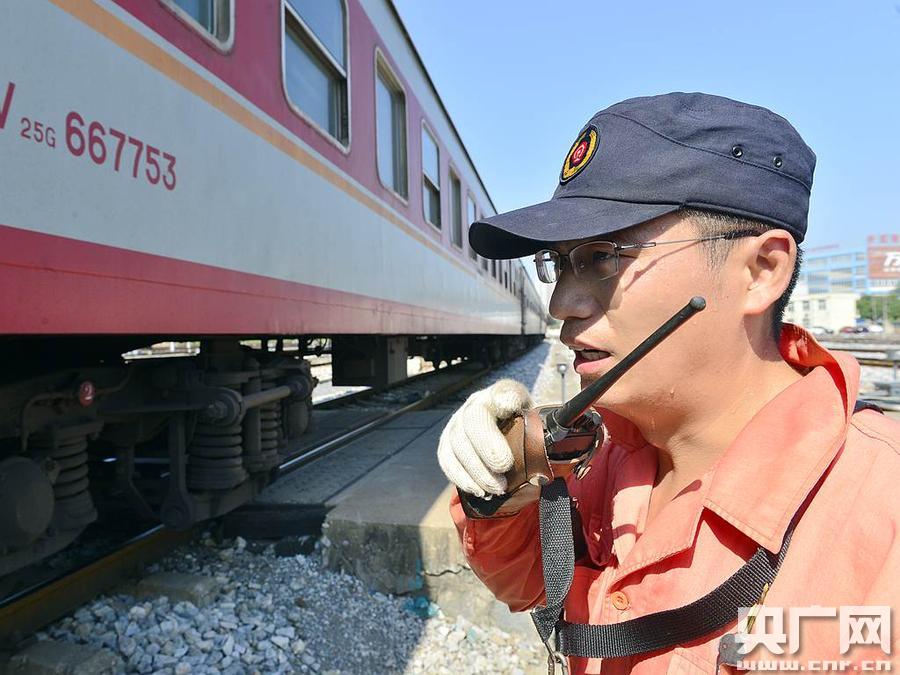 8月4日下午1點(diǎn)45分,在車(chē)廂外表的溫度超過(guò)60攝氏度的情況下,合肥站運(yùn)轉(zhuǎn)調(diào)車(chē)組調(diào)車(chē)員們身著橘紅色工作服,冒著高溫爬上爬下;在地面超過(guò)50攝氏度的炙烤下,加水工堅(jiān)守崗位,確保列車(chē)正常供水——就是這樣一群鐵路人,用汗水讓南來(lái)北往的旅客踏上平安旅途。