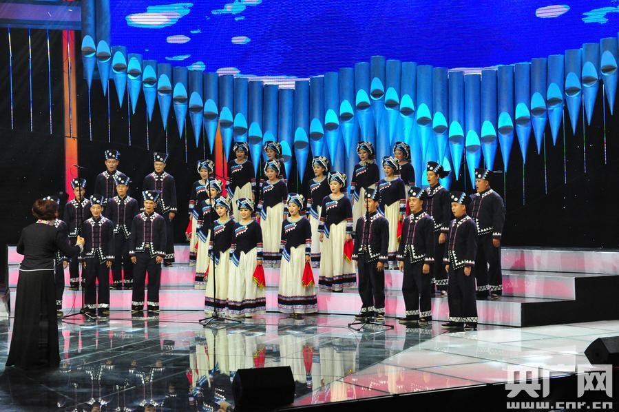 文山壯族坡芽合唱團(tuán)奪中央電視臺(tái)《歌聲與微笑——合唱先鋒》總冠軍,圖為比賽現(xiàn)場(chǎng)。