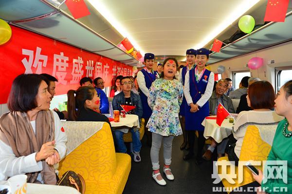 央廣網(wǎng)西安10月1日消息(記者劉濤 通訊員李俠軍 張雁南)國慶來臨,走進(jìn)西安開往延安的D5090次動(dòng)車,五顏六色的氣球和精致艷麗的五星紅旗將車廂裝點(diǎn)得喜氣洋洋,“相約動(dòng)車·喜迎國慶”車廂聯(lián)歡會(huì)正在舉行。詩歌朗誦、歌曲合唱、知識(shí)問答,再穿插著互動(dòng)的小游戲,歡聲笑語鋪滿了長(zhǎng)長(zhǎng)的車廂。
