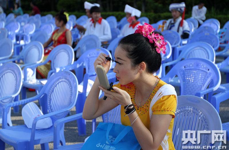 中國瑞麗第十五屆中緬胞波節(jié)今天上午開幕,參加慶祝的群眾在開幕前仔細補妝(央廣網(wǎng)記者 張江元 攝)