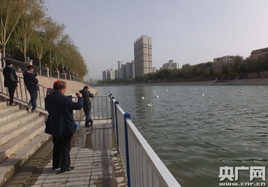 庫(kù)爾勒市民給天鵝拍照留念