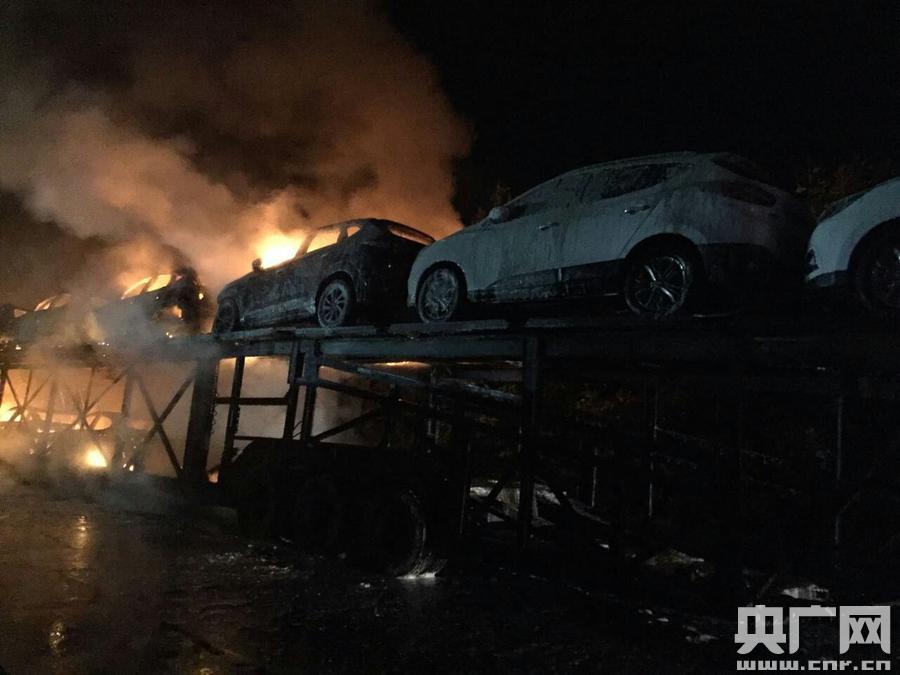 央廣網(wǎng)南寧1月26日消息(記者 張壘 許大為 通訊員 鐘德林)1月25日20時(shí)許,G80線廣昆高速公路岑溪段發(fā)生一起重型掛車行駛中起火,導(dǎo)致所運(yùn)載的13輛小汽車燒毀,無(wú)人員傷亡,交通暫時(shí)中斷,當(dāng)?shù)叵馈⒔痪綀?chǎng)處置。