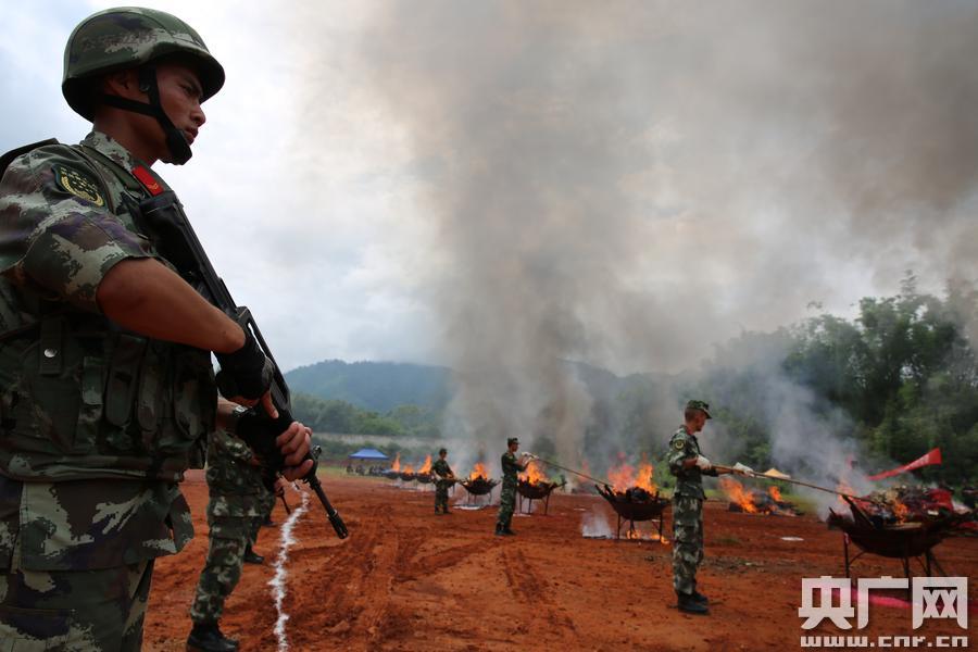 6月26日,德宏邊防官兵持槍警戒公開(kāi)銷毀毒品現(xiàn)場(chǎng)(肖林 攝)
