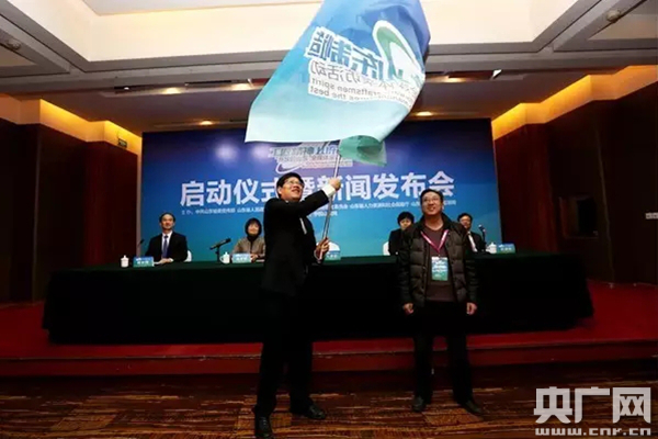 山東省委宣傳部副部長(zhǎng)王世農(nóng)為采訪團(tuán)授旗