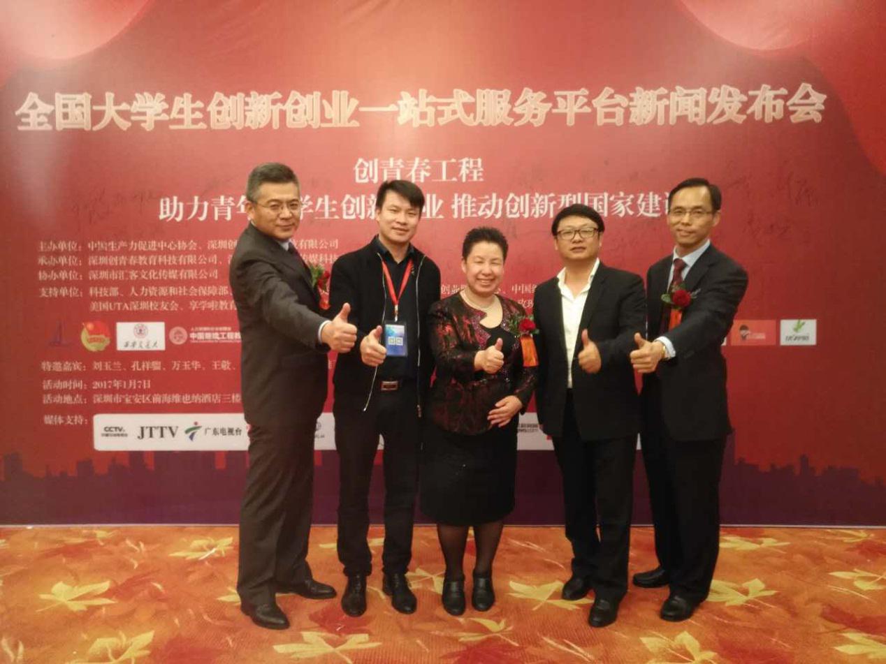央廣網(wǎng)深圳1月08日消息(記者 于揚(yáng))2017年1月7日,由中國生產(chǎn)力促進(jìn)中心協(xié)會(huì)、深圳創(chuàng)青春教育科技有限公司主辦,深圳市靈犀文化傳媒科技有限公司承辦、深圳市匯客文化傳媒有限公司協(xié)辦的創(chuàng)青春工程新聞發(fā)布會(huì)在深圳寶安區(qū)勝利召開。新聞發(fā)布會(huì)得到了科技部、人力資源和社會(huì)保障部、教育部、共青團(tuán)中央等部委,以及西安交通大學(xué)高新技術(shù)創(chuàng)業(yè)服務(wù)中心、中國繼續(xù)工程教育協(xié)會(huì)、小小世界集團(tuán)、創(chuàng)創(chuàng)投資等十幾家協(xié)會(huì)、企業(yè)、創(chuàng)投機(jī)構(gòu)和教育機(jī)構(gòu)的大力支持。中國生產(chǎn)力促進(jìn)中心協(xié)會(huì)處長王敬先生、小小世界集團(tuán)董事長、霸王集團(tuán)總裁萬玉華女士、創(chuàng)青春工程高級(jí)顧問、西安交通大學(xué)高新技術(shù)創(chuàng)業(yè)服務(wù)中心主任孔祥騮教授,以及深圳創(chuàng)青春教育科技有限公司創(chuàng)始人馬安華、秦伯庸、徐久升先生等十幾位領(lǐng)導(dǎo)嘉賓出席新聞發(fā)布會(huì)。