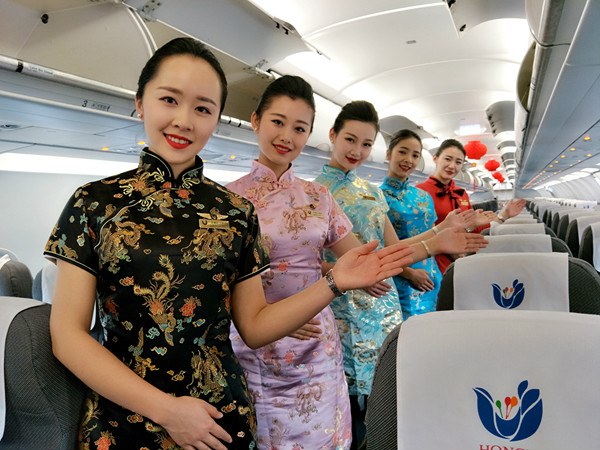 紅航空姐身著旗袍亮相客艙 攝影:鳳飛云
