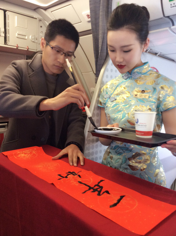 春聯(lián)作為必不可少的春節(jié)元素,也是吉祥的象征,紅航空姐提前準(zhǔn)備了紙筆,邀請(qǐng)機(jī)上旅客親手寫春聯(lián),表達(dá)對(duì)新年的美好期待和殷切祝福,旅客們踴躍參加,熱情高漲,客艙里充滿歡聲笑語(yǔ),暖意融融。