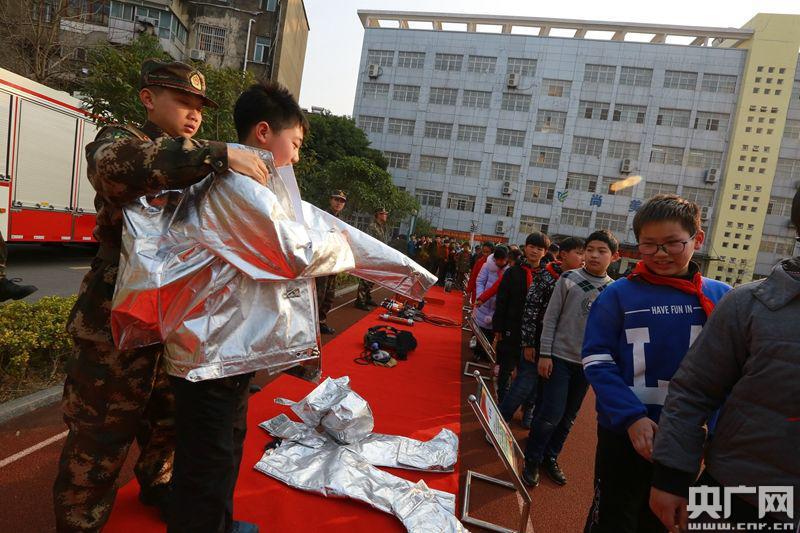 “這個(gè)是空氣呼吸器,當(dāng)消防員救火的時(shí)候,一般都要佩戴它,它可以保證救火時(shí)消防員的生命安全。”疏散逃生演練結(jié)束后,消防官兵又向師生們展示和介紹了各種消防服裝和器材裝備。