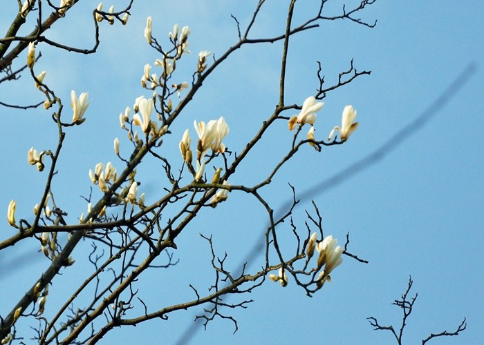 早開的白玉蘭,常常受到暗霜或寒風的凍害,導致其花瓣枯吊枝頭,乃至影響果實的結實。希望近日的“倒春寒”不會凍壞已經(jīng)綻放的白玉蘭花朵,待到晴日,讓游人欣賞到它們在藍天映襯下的、朵朵向上的潔白身姿。