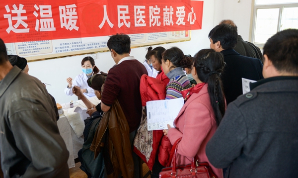 一大早,聞訊趕來的鄉(xiāng)親們就把臨時改造成“體檢中心”的村委會擠得水泄不通!霸缇吐牬逯魅握f人民醫(yī)院的專家要來,我們盼了好幾天呢!”該村有600多名村民,大部分青壯年都外出打工了,留守村民多是老人和孩子。
