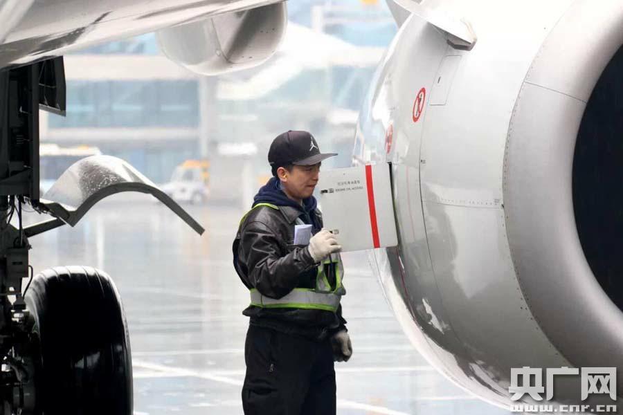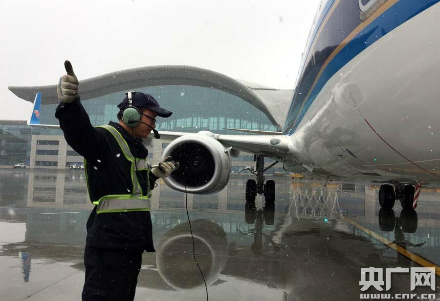 南航新疆機(jī)務(wù)維護(hù)人員指揮飛機(jī)出港(任春山攝) 送機(jī)班長岳偉介紹:“雨雪天氣,我們除了核對登機(jī)牌、送艙單等常規(guī)工作,還要一遍遍提醒旅客注意,更要眼觀六路及時(shí)幫助有困難的旅客,確保每名旅客的安全。工作量相當(dāng)于翻了一番! 機(jī)坪上,各個(gè)崗位除了日常工作,還要做好應(yīng)對雨雪的舉措。行李裝卸員用塑料布蓋住行李,防止淋濕,早出港共裝卸行李4000件;機(jī)務(wù)維護(hù)人員每個(gè)檢查都做都要“眼到、心到、手到”,防止雨點(diǎn)影響判斷,早出港共完成上千個(gè)飛機(jī)檢查維護(hù)步驟……