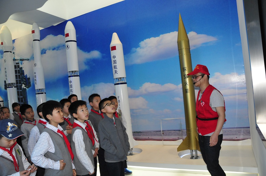 學(xué)生參觀運(yùn)載火箭模型