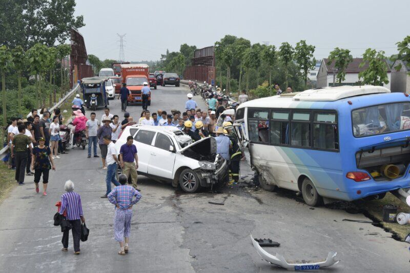 在荊州市荊州區(qū)荊馬線拍馬大橋的事發(fā)現(xiàn)場,一輛從馬山方向開往荊州的白色吉利GX7與荊州開往川店鎮(zhèn)的江淮小型中巴車相撞,吉利車斜跨在大路中央,中巴車被沖撞后退到2米左右的安全護欄上,車尾翹起老高,若不是有護欄早已翻到坡下。由于受撞擊的擠壓,兩車的車頭嚴重變形受損,擋風玻璃碎渣掉滿一地,兩車司機都不同程度的受傷被困,手上臉上全是鮮血,不停的呻吟哀叫,疼痛得額頭冒汗。