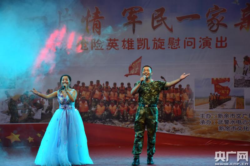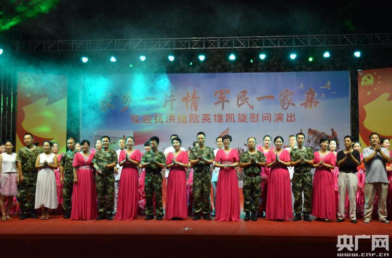 武警水電六支隊(duì)肖朝暉副政委代表?yè)岆U(xiǎn)官兵對(duì)演出隊(duì)的到來(lái)表示歡迎,并發(fā)表熱情洋溢的致辭。隨后,演出在舞蹈《盛世歡歌》中拉開(kāi)帷幕,小品《我們?cè)趽岆U(xiǎn)》由大隊(duì)官兵自編自導(dǎo)自演,再現(xiàn)了抗洪搶險(xiǎn)中,官兵們奮勇前進(jìn)、迎難而上、不懼艱險(xiǎn)的感人事跡。軍嫂演唱歌曲《望月》,反映了軍嫂日夜思念丈夫,在軍人背后默默付出的真實(shí)寫照,真情的表演引發(fā)了參戰(zhàn)官兵強(qiáng)烈的共鳴,進(jìn)一步激發(fā)了戰(zhàn)斗熱情。歌曲《咱當(dāng)兵的人》、《為了誰(shuí)》、《軍營(yíng)飛來(lái)一只百靈鳥(niǎo)》展現(xiàn)了一幅幅當(dāng)代軍人牢記職責(zé)、不辱使命,一心為人民服務(wù)的感人篇章,唱出了對(duì)祖國(guó)的熱愛(ài)和未來(lái)美好生活的向往,將演出推向了高潮。