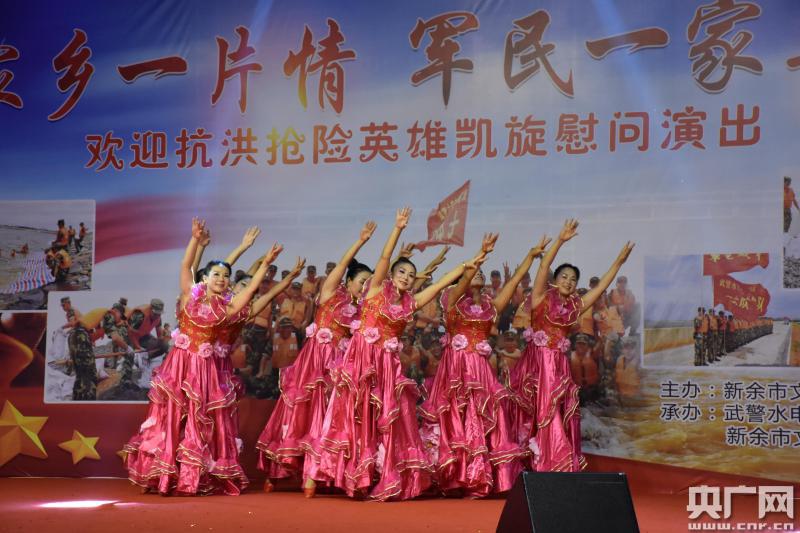 央廣網(wǎng)新余7月19日消息(記者李竟成 通訊員徐迎華 焦玉庚)七月新余,激情四射,熱情似火;橄欖軍營(yíng),燈光閃爍,盛況空前。7月17日,參加江西九江抗洪搶險(xiǎn)的武警水電六支隊(duì)一大隊(duì)官兵勝利凱旋。晚上,由新余市文廣新局主辦,大隊(duì)和新余市文化館承辦的“家鄉(xiāng)一片情,軍民一家親”迎抗洪搶險(xiǎn)英雄凱旋文藝演出,在大隊(duì)文體活動(dòng)中心隆重開(kāi)演,歡迎英雄凱旋,共續(xù)軍民魚(yú)水。