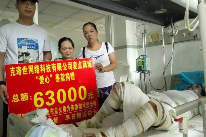謝承忠救人受傷的消息很快傳了出去。他所在學(xué)校的同事、親友、鄰居,以及當(dāng)?shù)亟逃到y(tǒng)、志愿者協(xié)會(huì)和民間團(tuán)隊(duì)的愛(ài)心人士,都紛紛捐款幫助他籌集醫(yī)療費(fèi)。7月29日,山圍鎮(zhèn)政府和麥點(diǎn)商城的負(fù)責(zé)人帶著6.3萬(wàn)元善款前往醫(yī)院看望、慰問(wèn)謝承忠。