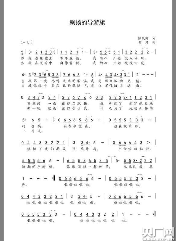 “當(dāng)我在廢墟上陣陣發(fā)顫/我的心開始沉入冰川/當(dāng)我第一次感到無比的恐懼/我是那么孤獨無援/突然一瞬間 一面旗幟在飄揚/我聽到了那穿越天地的召喚……”在這首歌曲中,詞作者——寧波市音協(xié)主席陳民憲把導(dǎo)游旗加以渲染,說它是“地動山搖的一片天”。曲作者黃河則吸收了歌詞中這種“穩(wěn)定”的力量,用一把吉他、一支長笛譜寫了一首“李健式”的民謠,并用鼓、弦樂和最后的大合唱賦予其厚度和色彩。