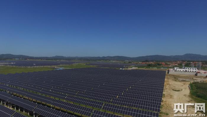 記者在現(xiàn)場看到,5萬余根整齊排列的高大水泥柱,托舉著一塊塊藍(lán)色的光伏板,在永記水庫上游形成了一望無際、蔚為壯觀的光伏發(fā)電場。變電站將陽光轉(zhuǎn)化的電能源源不斷輸送到高壓電網(wǎng)上。