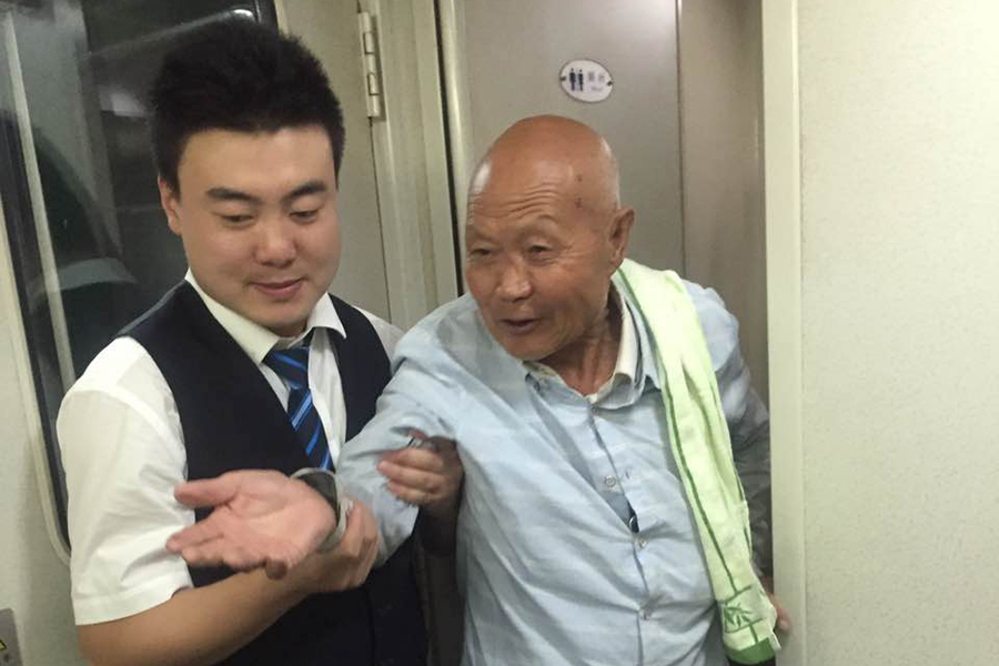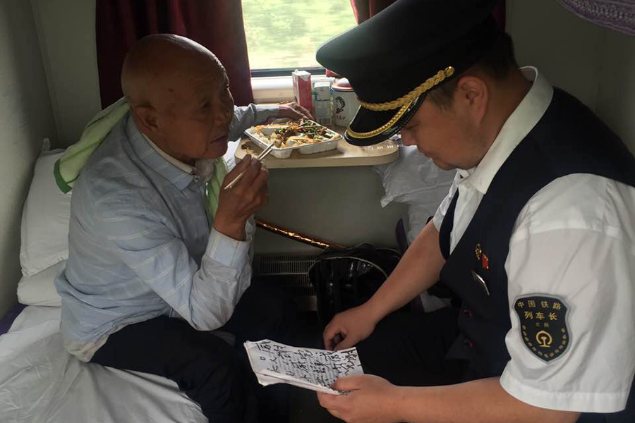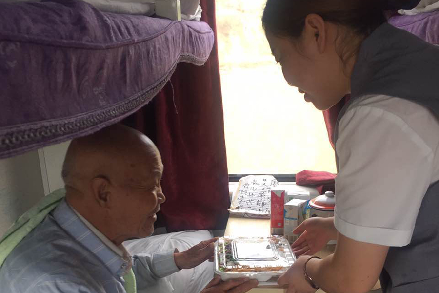 考慮到老人行動不方便,楊濤特意囑咐當班列車員給予老人重點照顧。一路上,列車員陳美美像照顧自己的親人一樣細心照顧著老人:為了讓老人及時遲到可口的飯菜,陳美美在征求了老人的意見后,在列車餐車專門定了盒飯;為了方便老人去衛(wèi)生間,陳美美找來了鄰車廂的男列車員攙扶老人上廁所。
