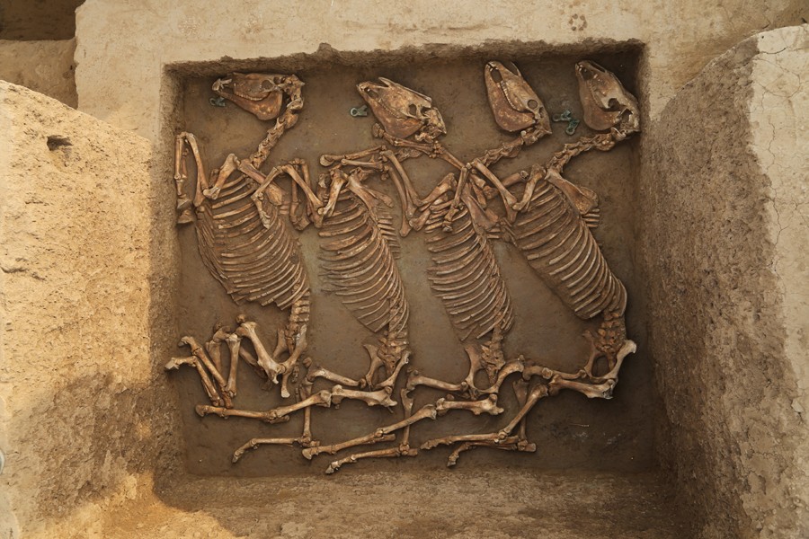 據介紹,2014年8月,新組建的周原考古隊對周原遺址鳳雛基址周圍的區(qū)域進行重點鉆探,發(fā)現(xiàn)一座車馬坑,內埋一車,四馬。陜西省考古研究院暨“考古發(fā)掘現(xiàn)場文物保護國家文物局重點科研基地”在第一時間采取了有效的現(xiàn)場保護措施。經省文物局批準并協(xié)調市、縣各級管理部門,對車馬采取了整體搬遷措施,并轉運至陜西省考古研究院涇渭基地進行室內清理發(fā)掘。陜西省考古院建設了專業(yè)大型整體搬遷文物清理保護實驗室,室內發(fā)掘工作從今年五月開始,歷時約五個月。