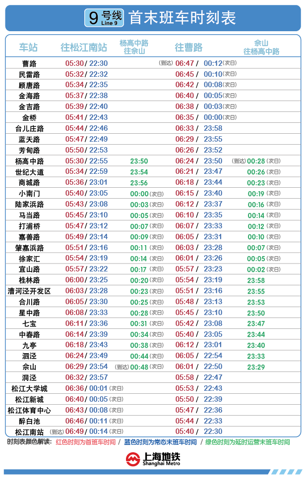 9號線三期楊高中路站——曹路站開通試運(yùn)營后,9號線常態(tài)全線運(yùn)營時(shí)間5:30~0:14(次日),9號線采用多點(diǎn)首班車發(fā)車,曹路站及楊高中路站往松江南站方向的首班車時(shí)間均為5點(diǎn)30分,從而9號線既有區(qū)段松江南站站——楊高中路站沿途各站的首班車時(shí)間均保持不變。而由于線路的延長,常態(tài)末班車時(shí)間均有所延后。其中,松江南站站往浦東方向常態(tài)末班車時(shí)間由目前21:50延后至22:30;楊高中路站往浦西方向常態(tài)末班車時(shí)間由目前22:30延后至22:55,楊高中路站往曹路站方向末班車23:50,全線運(yùn)營服務(wù)時(shí)間較開通前延長。