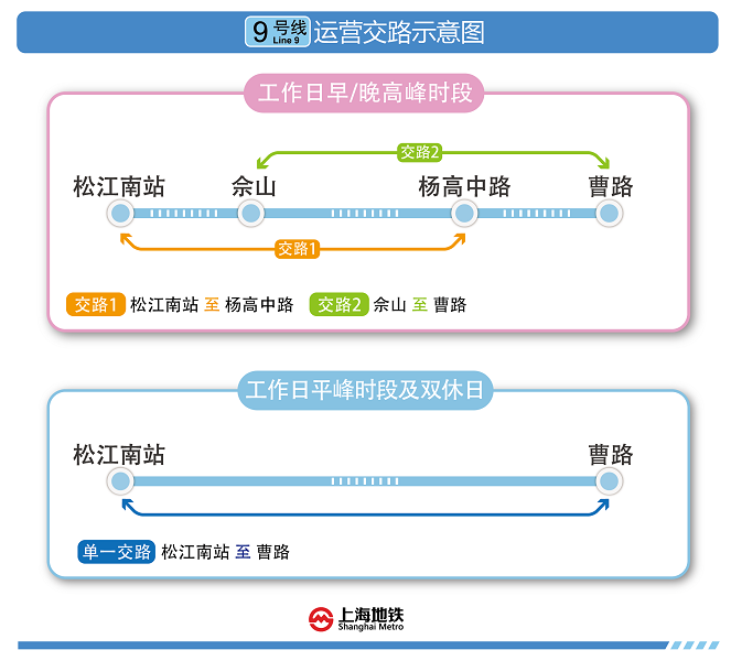 屆時(shí),工作日早晚高峰時(shí)段9號線列車開行雙交路,兩個交路分別為:松江南站站——楊高中路站,佘山站——曹路站;工作日平峰時(shí)段及雙休日、節(jié)假日,9號線全線開行單一交路,即:松江南站站——曹路站。
