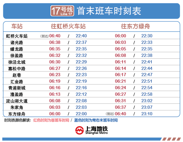 17號線東方綠舟站——虹橋火車站站開通試運(yùn)營后,全線運(yùn)營時(shí)間6:00~23:10。虹橋火車站站往東方綠舟站首班車6:00,末班車22:30;東方綠舟站往虹橋火車站站首班車為6:00,末班車為22:00。