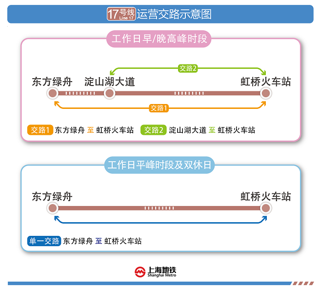 17號線虹橋火車站站——東方綠舟站開通試運(yùn)營后,工作日早晚高峰時(shí)開行大小交路,其中大交路運(yùn)行區(qū)段:東方綠舟站——虹橋火車站站;小交路運(yùn)行區(qū)段:淀山湖大道站~虹橋火車站站。工作日平峰時(shí)段及雙休日、節(jié)假日,全線開行單一交路,即:東方綠舟站~虹橋火車站站。