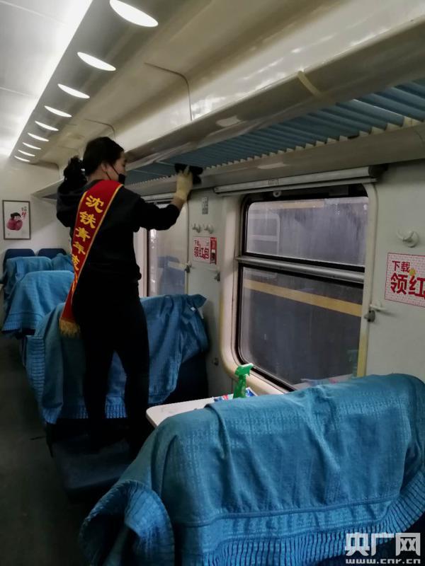 志愿者為K1572次列車進(jìn)行出庫(kù)衛(wèi)生整備,營(yíng)造溫馨出行環(huán)境