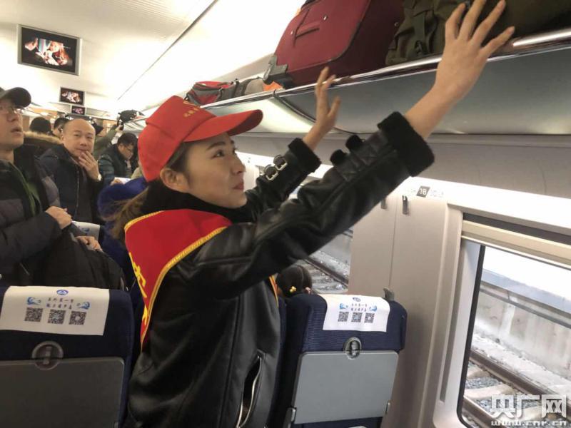 志愿者在車廂內(nèi)幫助旅客擺放行李