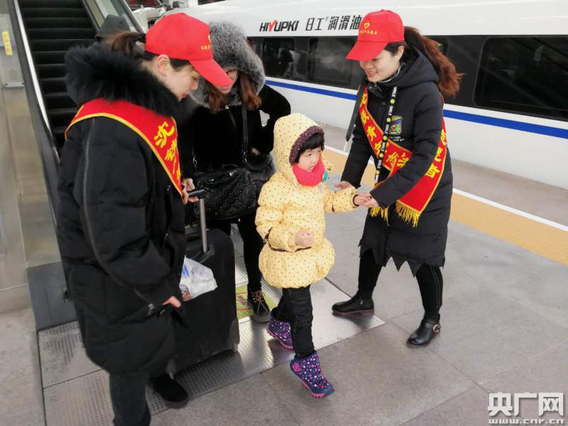 2號(hào)一大早,姑娘們就來(lái)到長(zhǎng)春火車站,為重點(diǎn)旅客提供“100米送站服務(wù)”。 22歲的賈雪,是這群姑娘中最瘦小的一個(gè)。別看小雪個(gè)子不高,站臺(tái)上拎行李、做引導(dǎo),一點(diǎn)也不輸給姐妹們。只見(jiàn)她左手抱著孩子,右手拎著旅客的行李,半個(gè)小時(shí)下來(lái),臉蛋凍得通紅,卻始終帶著微笑。在步履匆匆的春運(yùn)人流中記者看到,這些頭戴小紅帽、身披紅綬帶的鐵路姑娘們活躍在站臺(tái)上、候車大廳里,格外引人注目。她們有的攙扶老人上車,有的幫農(nóng)民工兄弟拎工行李,有的幫助殘疾人旅客推輪椅……東北凜冽的寒風(fēng)中,人群中穿梭忙碌的這些“95后”姑娘,細(xì)致周到的服務(wù),讓旅客感到濃濃暖意,也成為今年吉林鐵路春運(yùn)大軍中一道亮麗的風(fēng)景線。