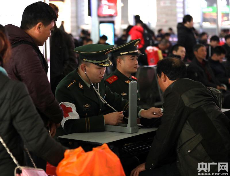 據(jù)了解,春運(yùn)期間,執(zhí)勤官兵在維護(hù)正常秩序的同時,為旅客群眾辦實(shí)事、解難題,開展便民服務(wù),車站后期將以流動醫(yī)療點(diǎn)為主,衛(wèi)生員隨巡邏官兵進(jìn)行流動巡診,免費(fèi)為需要幫助的旅客量血壓、發(fā)放應(yīng)急藥品,受到了廣大旅客的普遍歡迎。