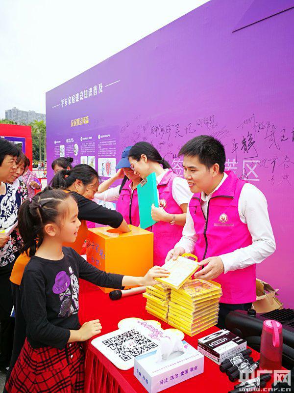 遇到家暴如何求助?文明行為知多少?活動現(xiàn)場,百萬家庭“反家暴·創(chuàng)平安”線上線下簽名承諾活動隆重舉行;平安家庭情景劇《教訓(xùn)》表演;婚調(diào)、禁毒和社區(qū)平安家庭建設(shè)者工作經(jīng)驗分享;50名男性志愿者反家暴宣言;深圳市婦女維權(quán)工作亮點展示墻;龍華好家庭有聲故事街;婦兒權(quán)益關(guān)愛公益服務(wù)體驗街;憲法、反家庭暴力法以及婚姻法司法解釋有獎知識競答等活動輪番上演,社區(qū)居民帶著家人流轉(zhuǎn)各個活動攤位答題贏獎品。