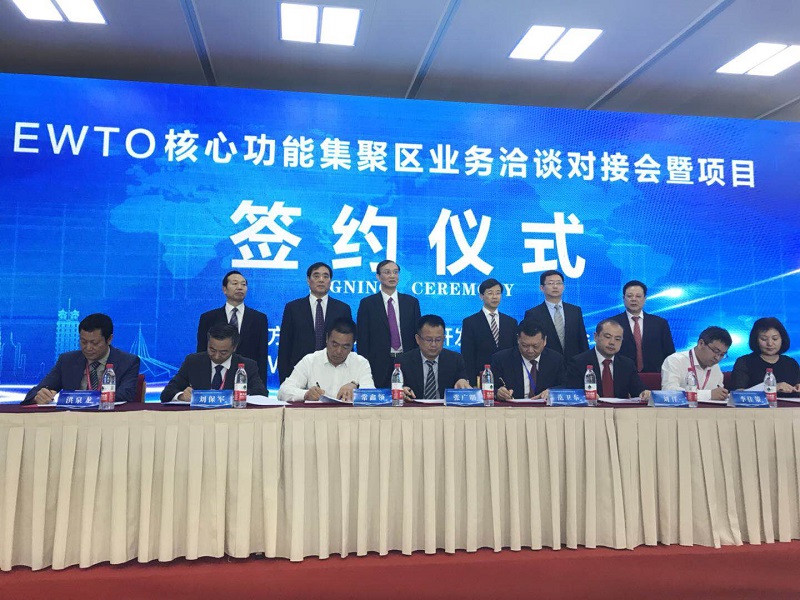 會上還舉行了EWTO核心功能集聚區(qū)業(yè)務洽談對接會暨項目簽約儀式,共有45個項目現(xiàn)場簽約,簽約金額230億元,業(yè)態(tài)涵蓋現(xiàn)代物流、電子商務、金融服務等多個領域。