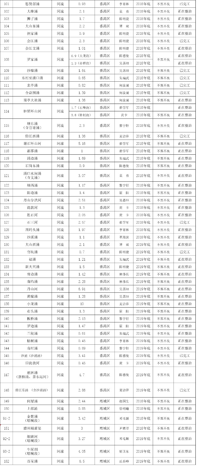 此次公布的為剩余的152條黑臭河涌,按要求,這批河涌要在2020年前逐步完成基本消除黑臭目標(biāo)。從各區(qū)分布看,番禺區(qū)數(shù)量最多,一共49條居榜首位置;越秀區(qū)2條,數(shù)量最少。