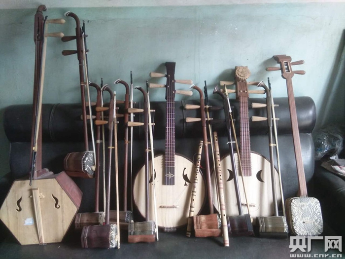表演團隊除了自編自導,樂隊里用的樂器也是自己做的,比如二胡、小阮、中阮、中胡、鼓板等,全部出自林虎老師的手。林虎今年69歲,頭發(fā)花白,但是看起來精神很好。他住在永樂村的一座農(nóng)家小院里,一樓東邊的谷物間是他的琴房,稍有空閑就會在這里彈上一兩個小時。
