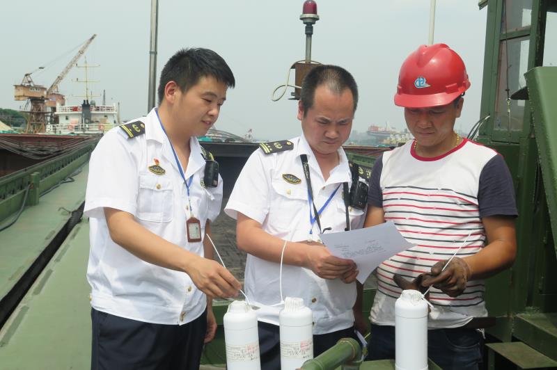 檢查組還對一條?吭诖a頭邊的內(nèi)河運輸船舶“浙紹興貨0717”輪正在使用的燃油質(zhì)量的進行了取樣,下一步將送往檢驗單位進行燃油質(zhì)量的檢驗。