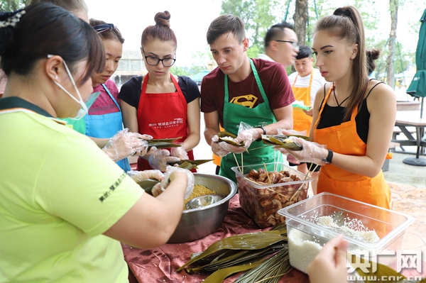 當天上午,糯米、粽葉、去皮綠豆、腌制好的五花肉等材料一字排開,上千名中外游客在經(jīng)驗豐富的民間包粽師傅帶領(lǐng)下學(xué)包粽子。只見師傅拿起粽葉挽成漏斗,鋪上糯米塞入五花肉,再鋪一層糯米,粽葉一合,拿繩子迅速捆扎,一個結(jié)實的傳統(tǒng)咸肉粽就包好了。一系列流暢的動作,看得老外們直呼“amazing(神奇)”!