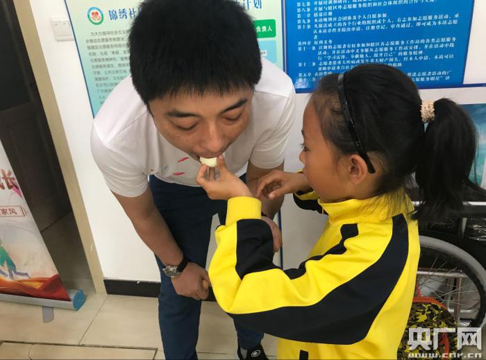 社區(qū)的工作人員給參加活動的每個孩子綁上了五彩線組織孩子和爸爸們一起參與頂雞蛋的活動;有的孩子跟自己的爸爸一起頂雞蛋,有的則是找到自己的伙伴一起頂雞蛋,沒有“搭檔”的爸爸們則是像大孩子一樣,嚷嚷個不停也要找“對手”頂雞蛋,孩子們和他們的爸爸歡笑著,叫鬧著,頂著雞蛋,分出“最棒”的雞蛋并給那枚雞蛋綁上了“狀元五彩線”,頂碎的雞蛋由孩子們剝好親手喂給自己的爸爸。吃著孩子為他們剝的雞蛋爸爸們的臉上有著不可抑制的笑,那笑容里有著欣慰,有著開心……