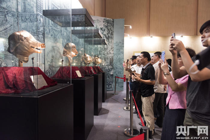 游客在觀看參展的4個(gè)國寶獸首(央廣網(wǎng)記者 官文清 攝)