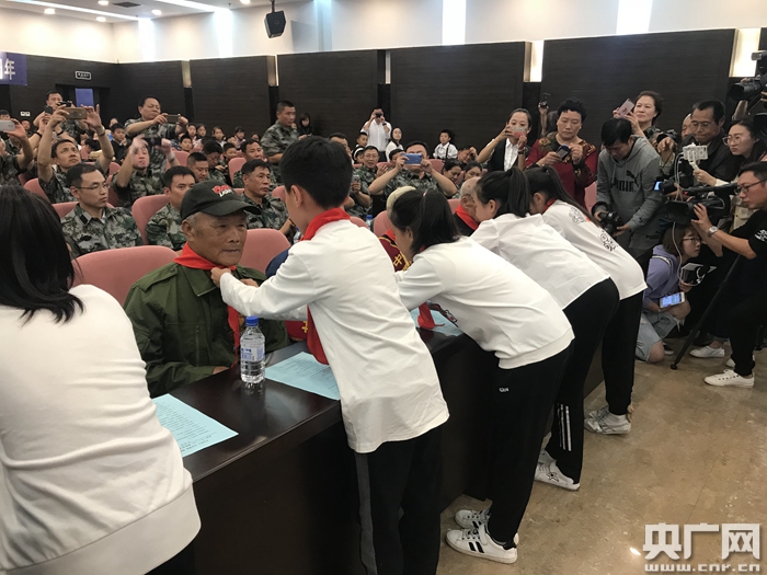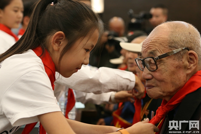 學(xué)生們?yōu)榭箲?zhàn)老兵佩戴紅領(lǐng)巾(央廣網(wǎng)記者 苑競(jìng)瑋 攝)
